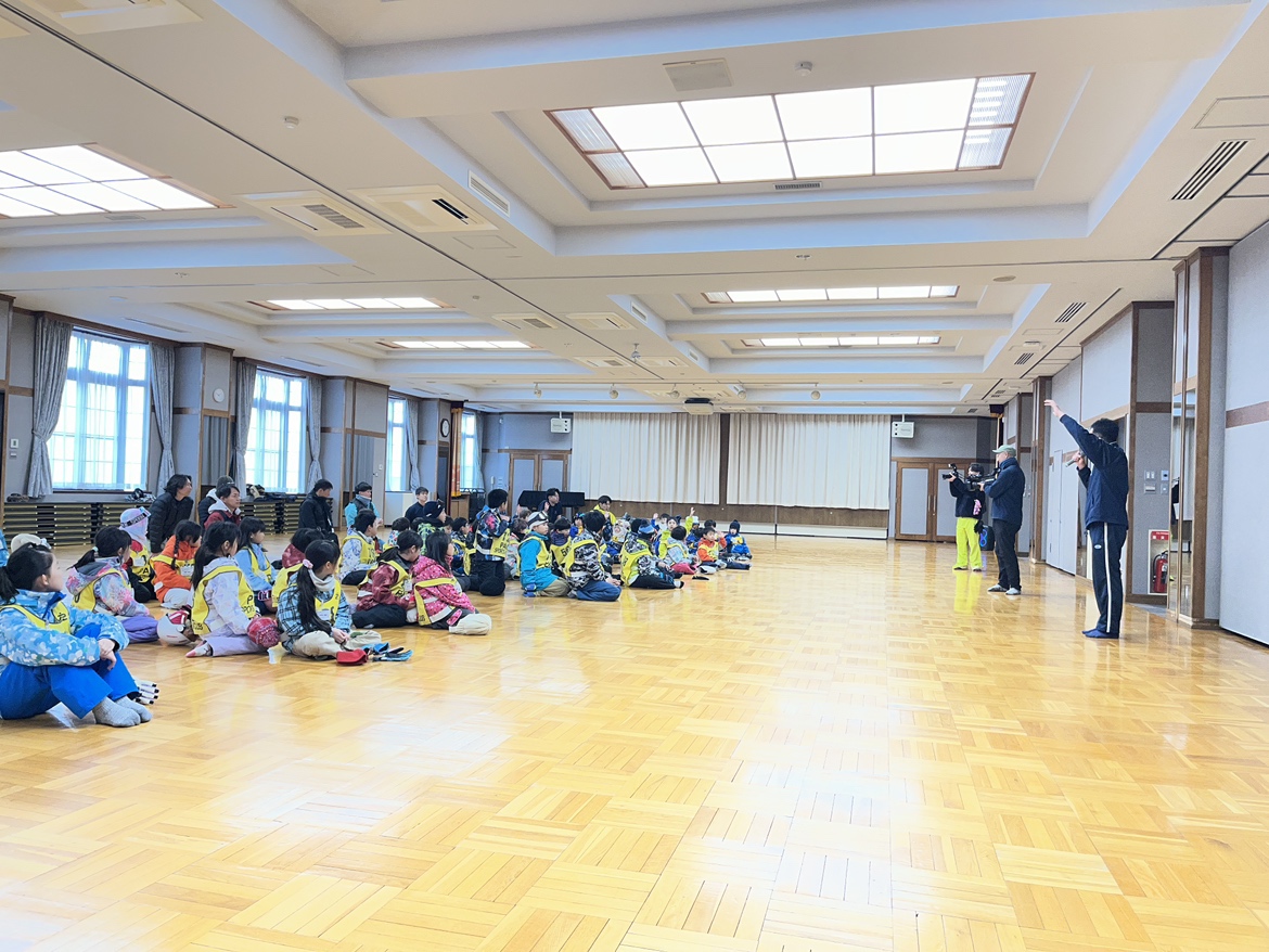 今回のスクールで初めて滑る子どもたちは、ドキドキ・ワクワクしながらゲレンデへ出発。上手な転び方や止まり方の練習を行ない、